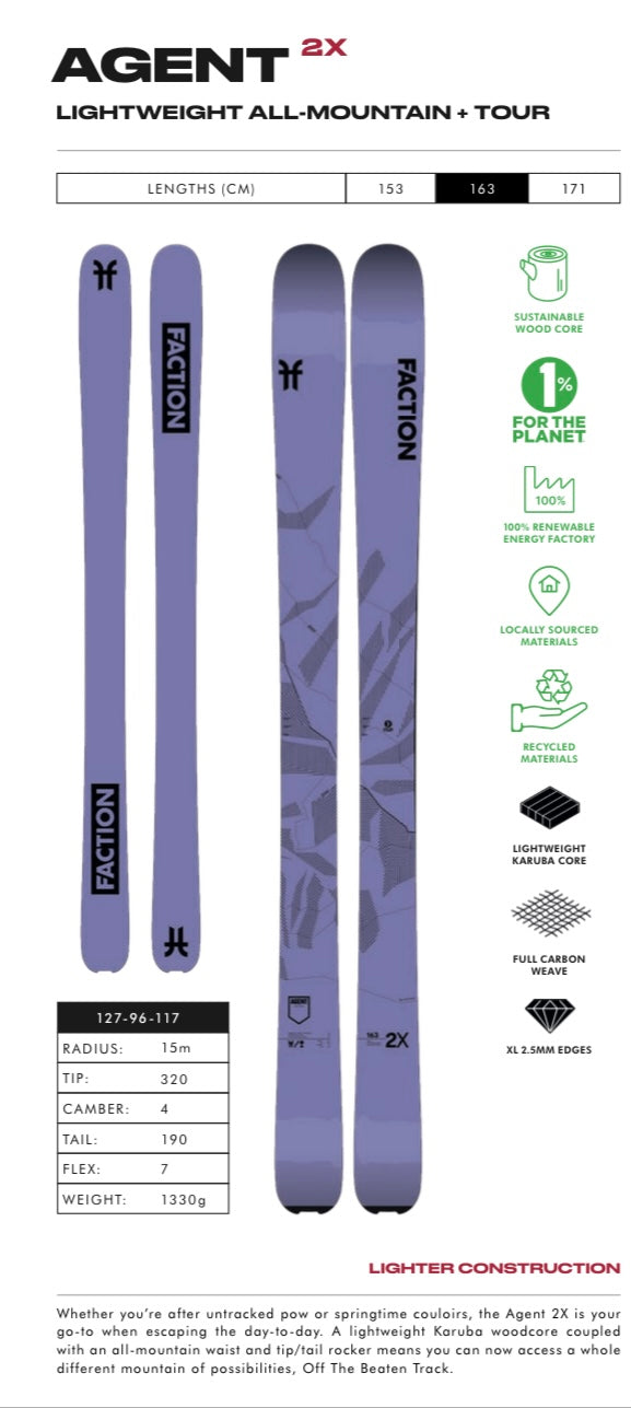 The Faction Agent 2X ski is the one-stop solution for touring skiers. The lightweight karuba wood core is backed by a carbon weave and the versatile 96 mm waist width combined with tip and tail rocker make the ski light on the ascent and thrilling on the descent.Whether you’re after the treats of a powder-laden field or rush of a steep couloir, every hard-earned turn will feel that much better with the Agent 2X under your feet. The Agent 2X features the same construction as the Agent 1, with an alternate topsheet to celebrate women in skiing.