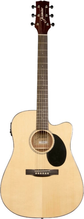 The Jasmine JD-36CE is an acoustic/electric dreadnought guitar that offers a sleek Venetian cutaway and a state of the art electronics system that lets you take your sound to center stage. Great for any player seeking the bold sounds that the dreadnought body style offers, the JD-36CE features a select spruce top with Jasmine’s Advanced “X” Bracing, and sapele back and sides. The slim neck and short 24 3/4″ scale length provide comfortable feel and exceptional playability, and the onboard Designed by B-Band® preamp system gives you a built in digital tuner and four-band EQ for excellent amplified sound and performance versatility. Other premium features include a rosewood fingerboard and bridge, chrome die-cast tuners for great tuning stability, pearloid rosette and full gloss Natural finish.